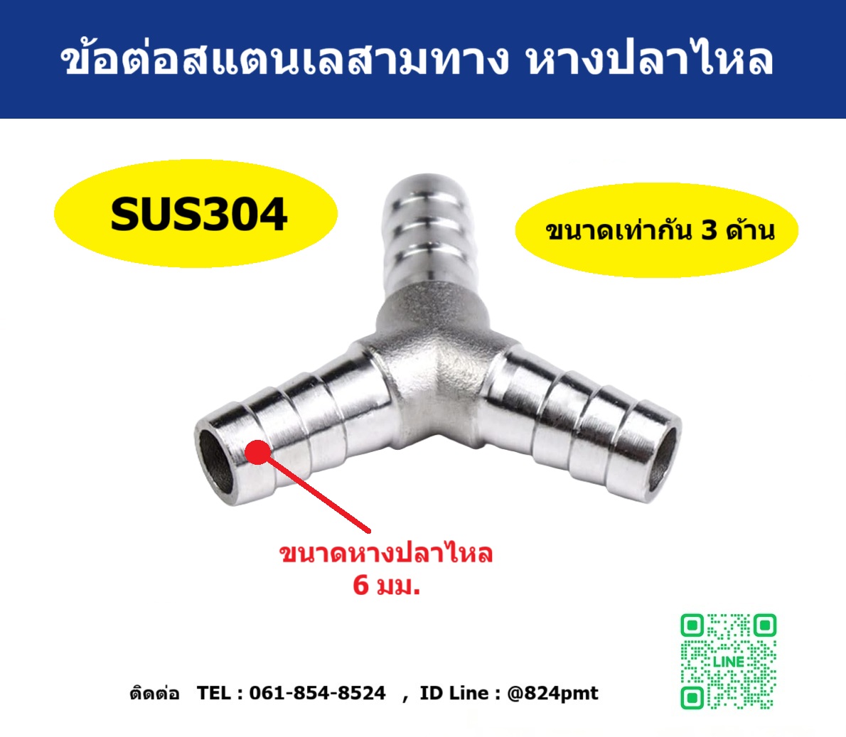 ข้อต่อสแตนเลสสามทางตัววาย ขนาดหางปลาไหล 6 มม.